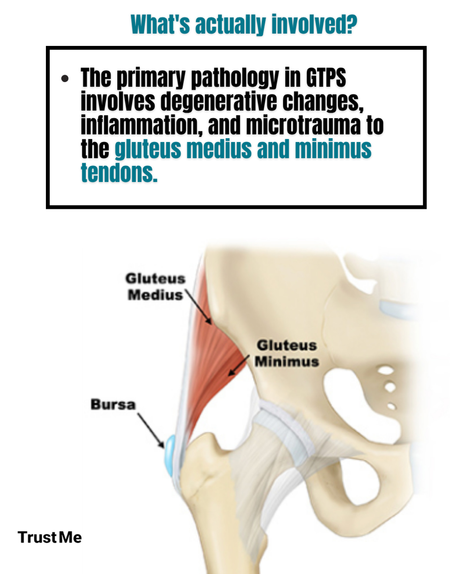 Once thought to be primarily “bursitis,” research now shows that GTPS involves much more than inflammation—it’s often a tendinopathy of the gluteus medius and minimus tendons, sometimes with associated bursal irritation.