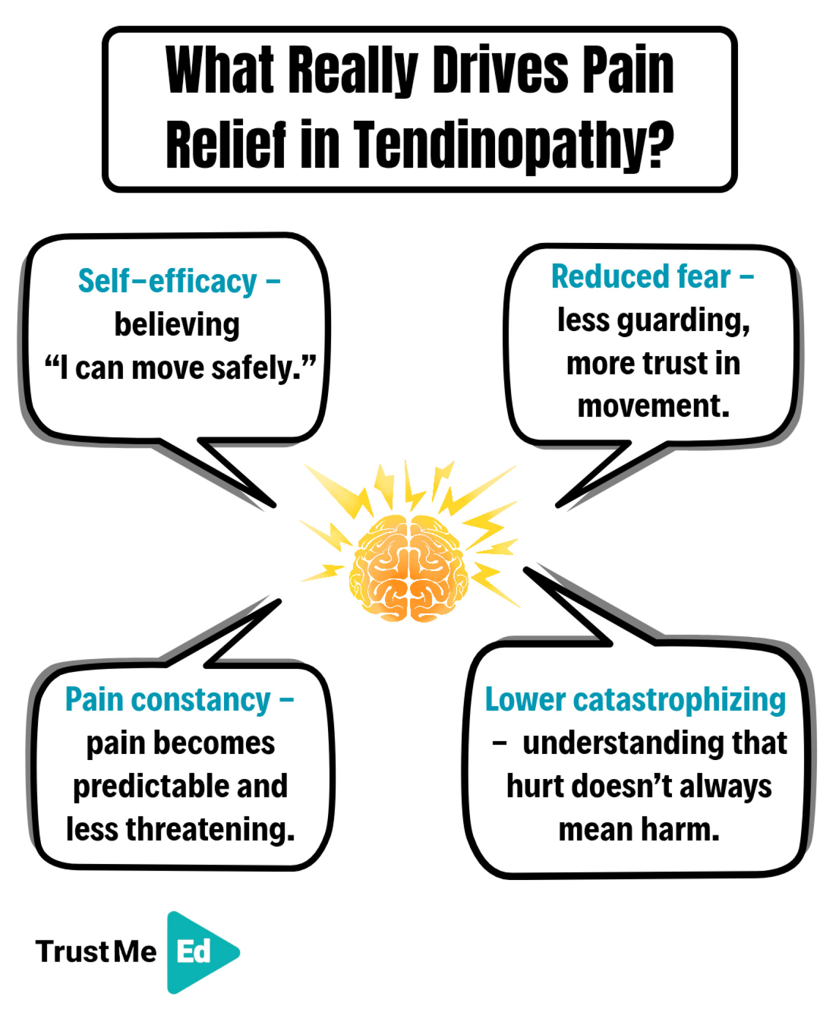 This shift in self-efficacy often leads to noticeable pain relief, even if the tendon itself hasn’t changed yet.