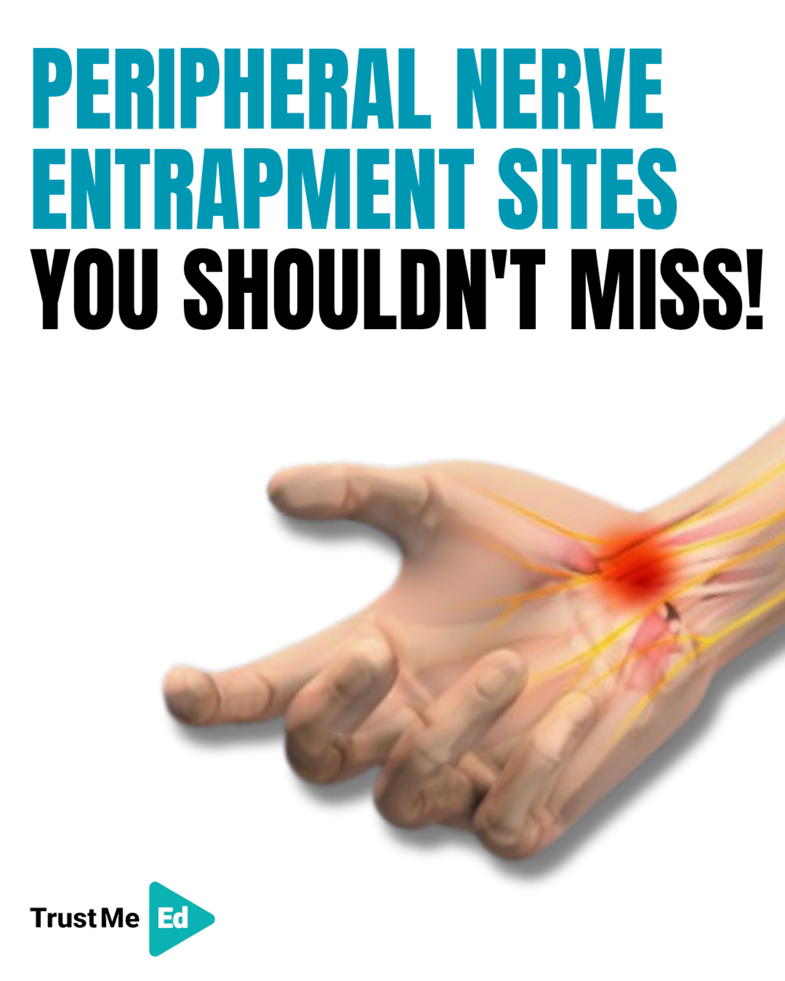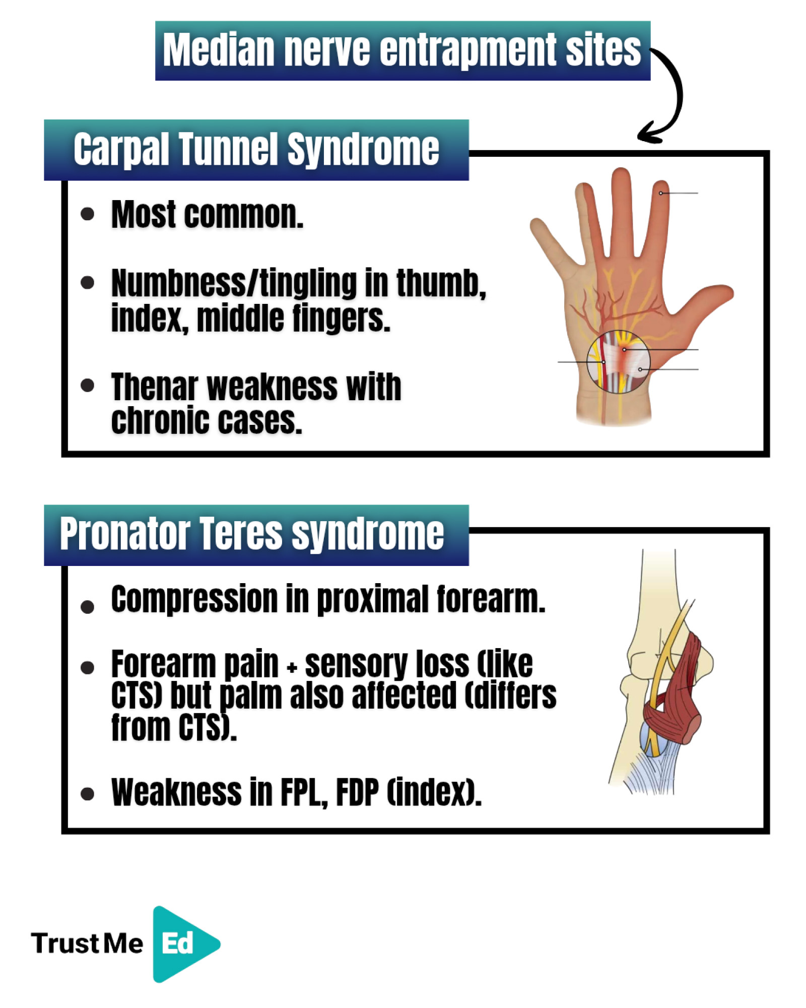 • Median Nerve → Carpal tunnel, Pronator teres.