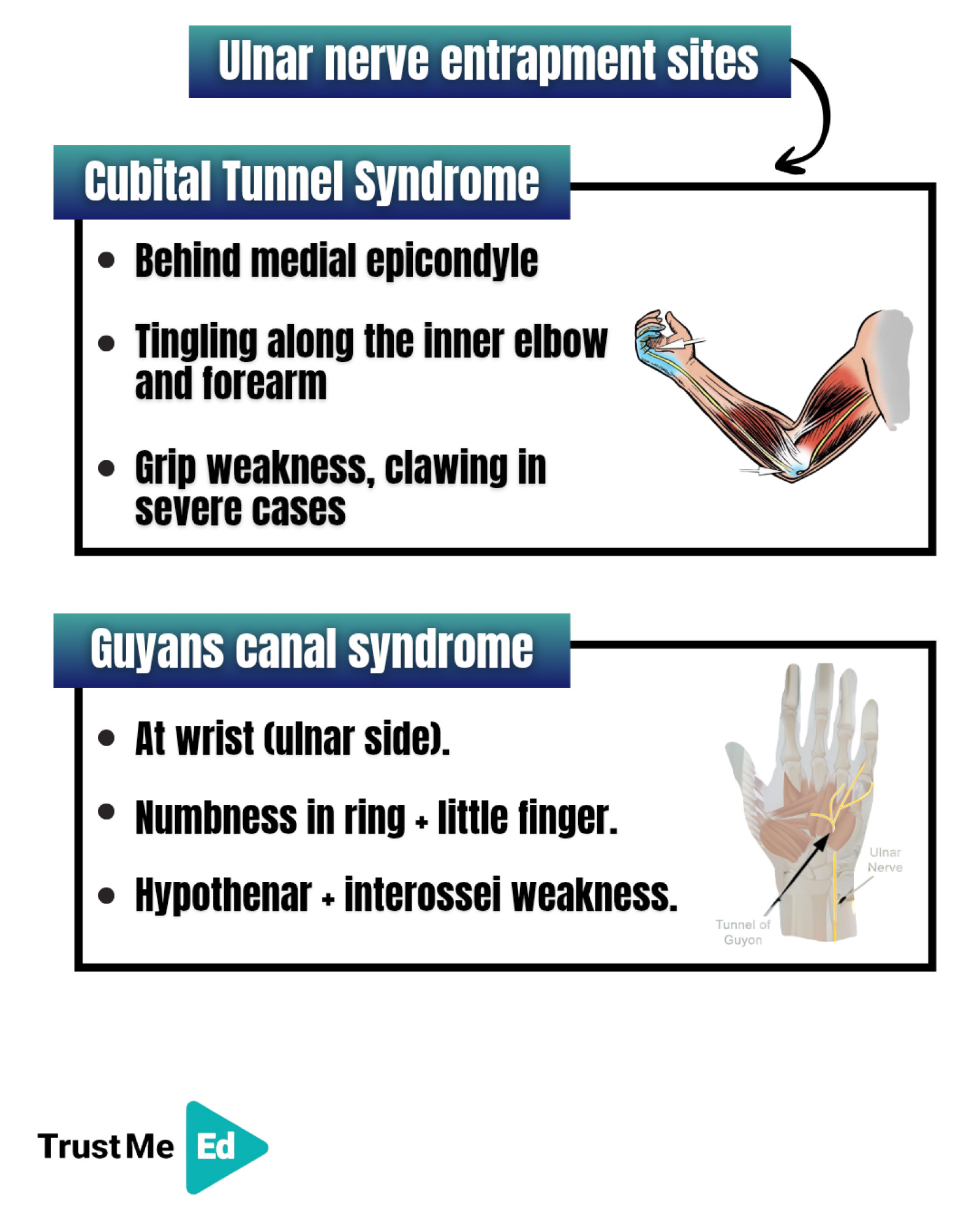 • Ulnar Nerve → Cubital tunnel, Guyon’s canal.