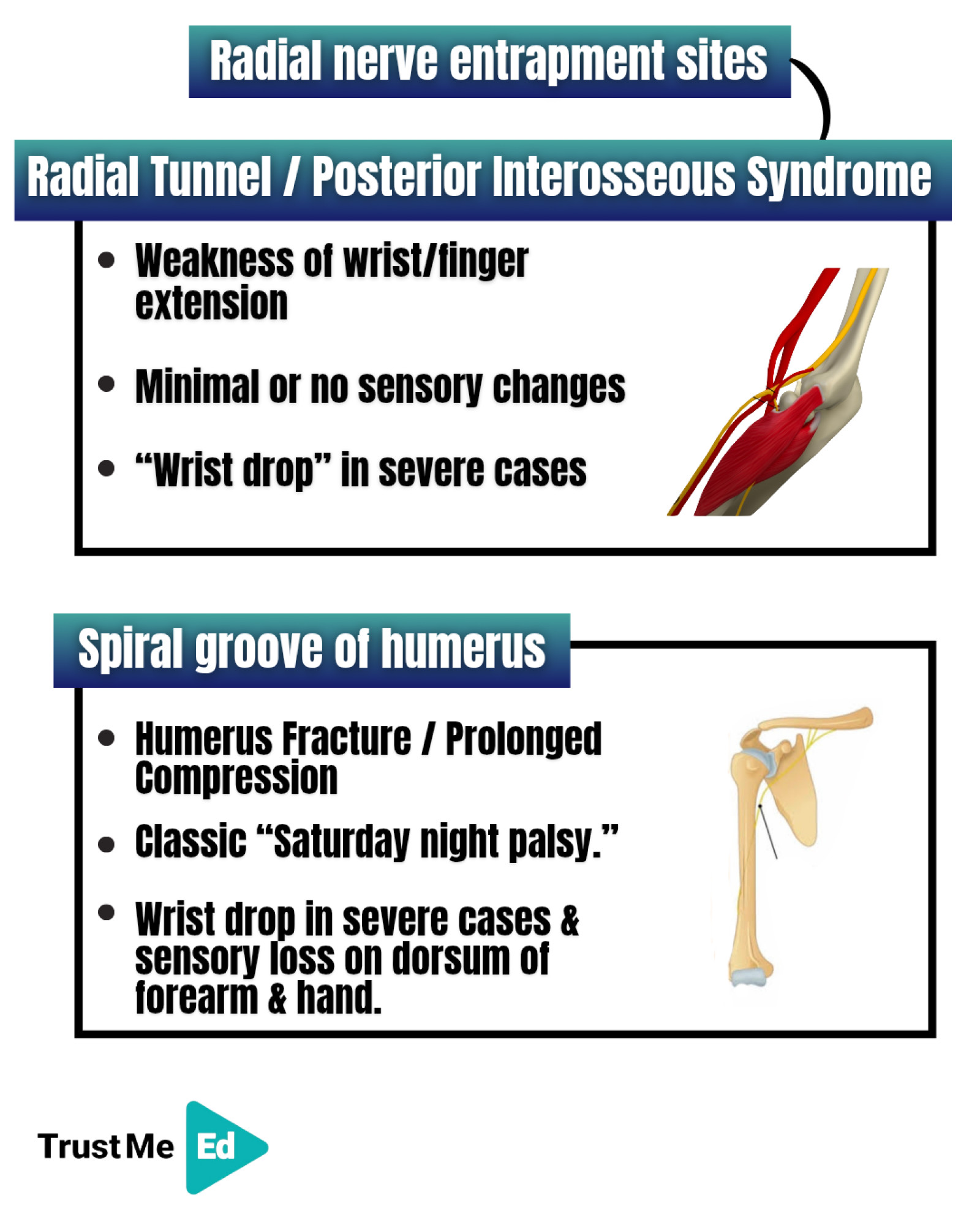 • Radial Nerve → Spiral groove, Supinator (Arcade of Frohse).