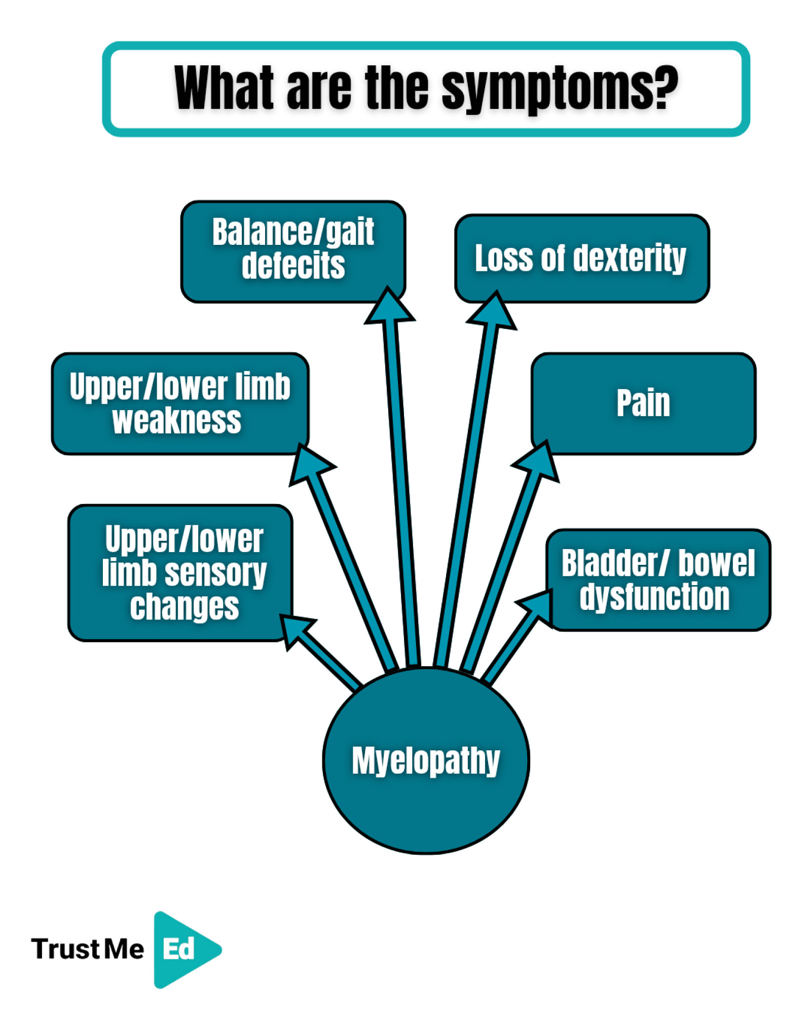 DCM typically develops slowly, often over months or years. Symptoms may come and go, making it tricky to recognise.