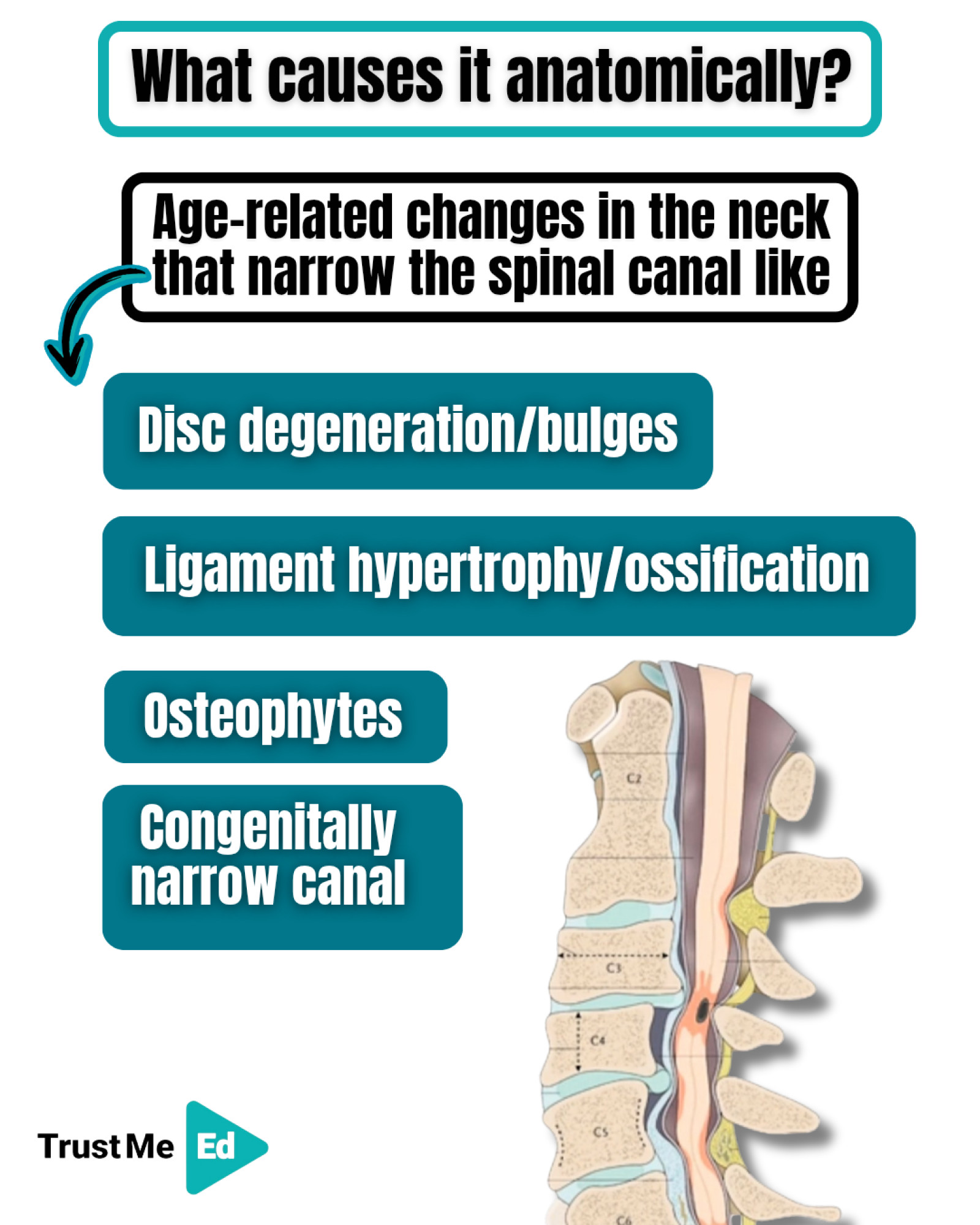 Think of it as a “slow-motion spinal cord injury” caused not by trauma, but by gradual wear and tear.