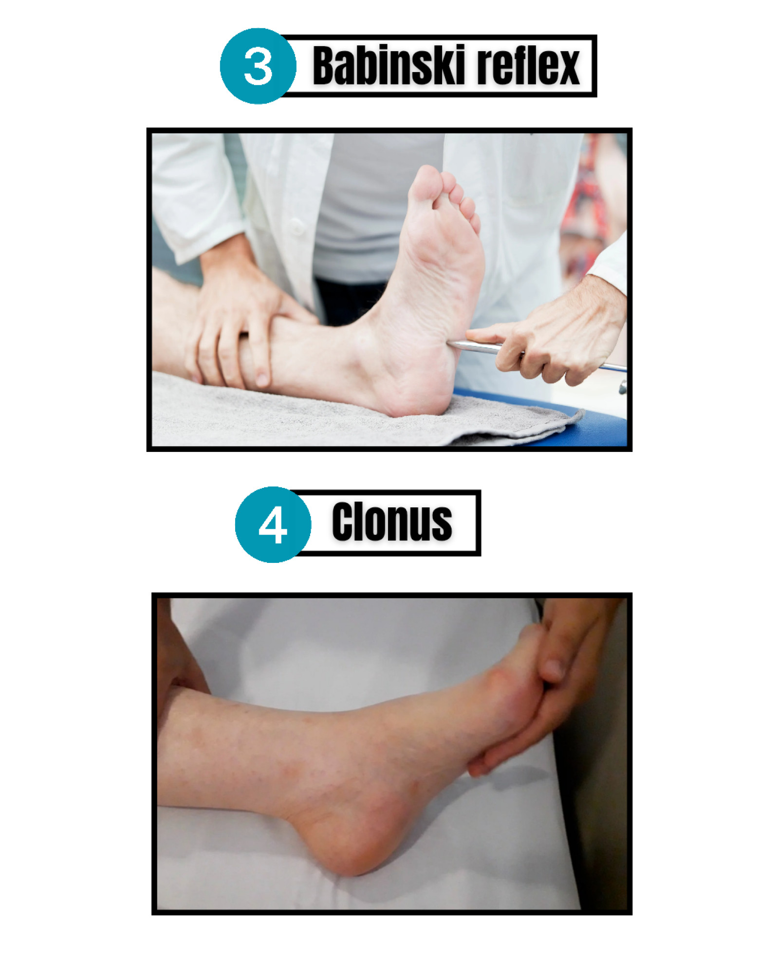 Stroking the sole of the foot leads to big toe extension.Suggests corticospinal tract involvement.